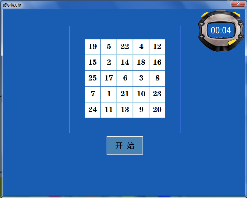 舒爾特方格是在一張方形卡片上畫(huà)上 1CM × 1CM 的 25 個(gè)方格,格子內(nèi)任意填寫(xiě)上阿拉伯?dāng)?shù)字 1 — 25 共 25 個(gè)數(shù)字。訓(xùn)練時(shí),要求被測(cè)者用手指按 1 — 25 的順序依次指出其位置,同時(shí)誦讀出聲。